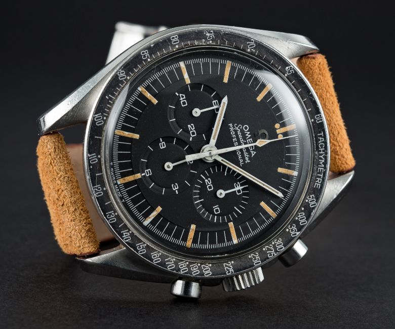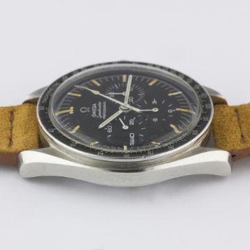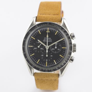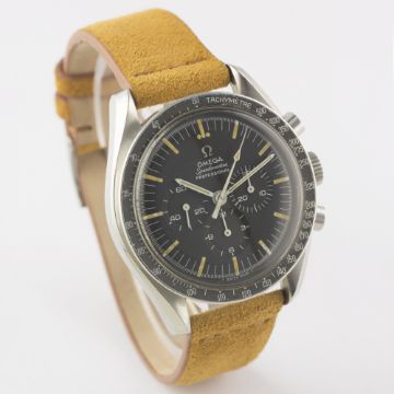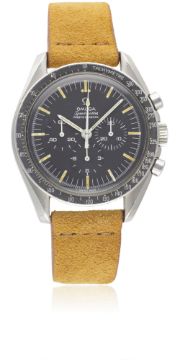 A RARE GENTLEMAN'S STAINLESS STEEL OMEGA SPEEDMASTER PROFESSIONAL CHRONOGRAPH WRIST WATCH CIRCA 1966, REF. 105012-66Movement: 17J, manual wind, cal. 321, signed Omega Watch Co, numbered.Case: Diameter approx. 42mm, screw back, Speedmaster emblem on case back, signed Omega Watch Co, dust cover, "DON" tachymetre bezel faded to grey, Omega crown.Strap: Suede. CONDITION REPORTDial: Original dial in excellent condition.Movement: Working at present.Case: In excellent condition, with some light scratches due to general use.Strap/Bracelet: In excellent condition.