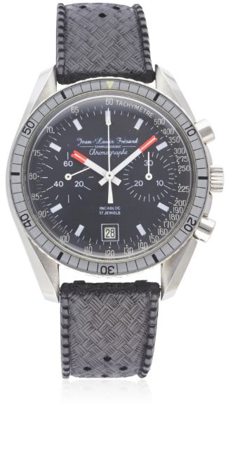A RARE GENTLEMAN'S "NOS" STAINLESS STEEL JEAN LOUIS FRESARD CHRONOGRAPH WRIST WATCH CIRCA 1970, WITH HF "SPEEDMASTER" CASEMovement: 17J, manual wind, Valjoux cal. 7734.Case: Diameter approx. 42mm, screw back, maker's mark HF, numbered, 60 minute rotating bakelite bezel, original crown & pushers.Strap: Rubber Tropic. CONDITION REPORTDial: Original dial in excellent condition.Movement: Working at present.Case: In excellent condition.Strap/Bracelet: In excellent condition.The watch is in new old stock condition.