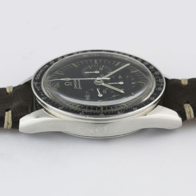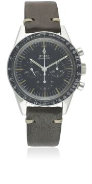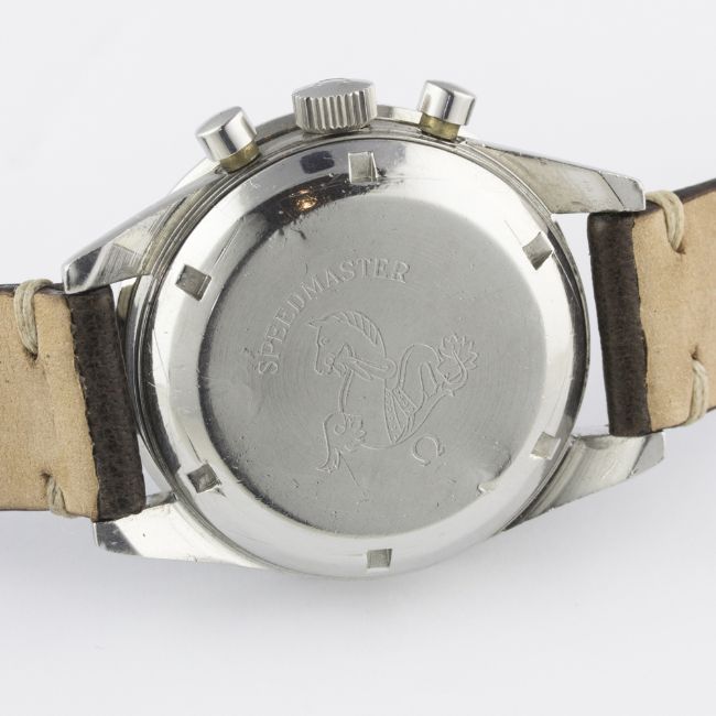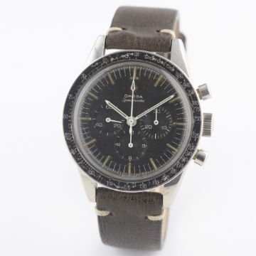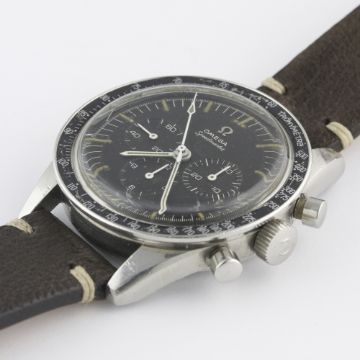 A RARE GENTLEMAN'S STAINLESS STEEL OMEGA SPEEDMASTER "ED WHITE" CHRONOGRAPH WRIST WATCH DATED 1966, REF. ST 105.003-65 WITH OMEGA EXTRACT OF ARCHIVES SHOWING DELIVERY TO THE UNITED KINGDOM Movement: 17J, manual wind, cal. 321, signed Omega Watch Co., numbered. Case: Diameter approx. 40mm, screw back, signed Omega Watch Co, Speedmaster emblem on case back, dust cover, "DON" tachymetre bezel, Omega crown.Strap: Leather. CONDITION REPORTDial: Original dial in very good condition, dial showing a slight brown patina and signs of age.Movement: Working at present.Case: In good condition, with small scratches due to general use.Strap/Bracelet: In excellent condition.