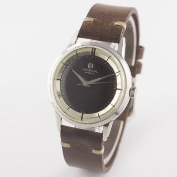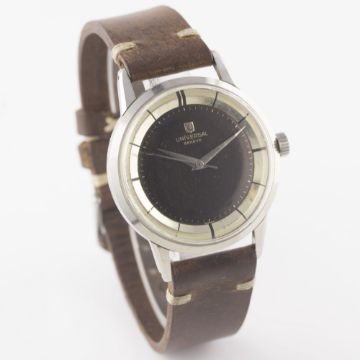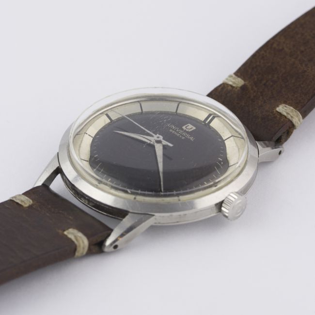 A RARE GENTLEMAN'S STAINLESS STEEL UNIVERSAL GENEVE "PRE POLEROUTER" WRIST WATCH CIRCA 1950s, REF. 206515 1 WITH "TROPICAL" DIALMovement: 17J, manual wind, cal. 332, signed Universal Geneve.Case: Diameter approx. 35mm, snap back, signed Universal Geneve, numbered. Strap: Leather. CONDITION REPORTDial: Original dial in very good "tropical" condition.Movement: Working at present.Case: In very good condition, with some scratches due to general use.Strap/Bracelet: In very good condition.