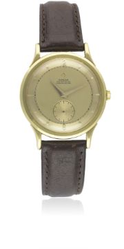 A FINE GENTLEMAN'S 18K SOLID GOLD OMEGA AUTOMATIC CHRONOMETRE WRIST WATCH CIRCA 1948, REF. 2500 WITH SOLID GOLD DIAL, ACCOMPANIED BY RETAILERS BOXMovement: 17J, "bumper" automatic chronometer with RG regulator, cal. 333, signed Omega Watch Co., numbered. Case: Diameter approx. 35mm, snap back, signed Omega Watch Co, numbered, 18k hallmarks, Omega crown.Strap: Leather. CONDITION REPORTDial: Original dial in excellent condition.Movement: Working at present.Case: In excellent condition, with some small scratches due to general use.Strap/Bracelet: In good condition.