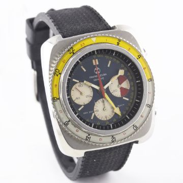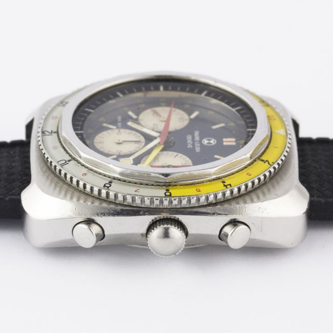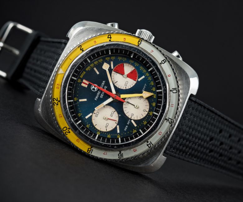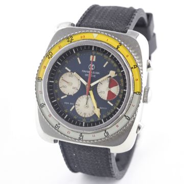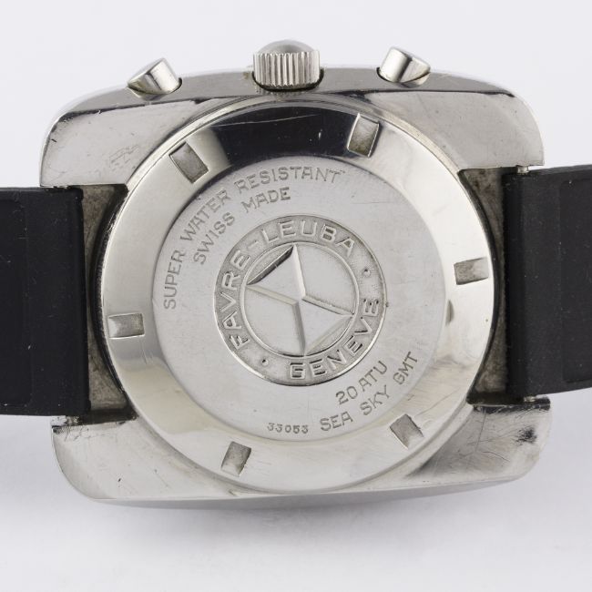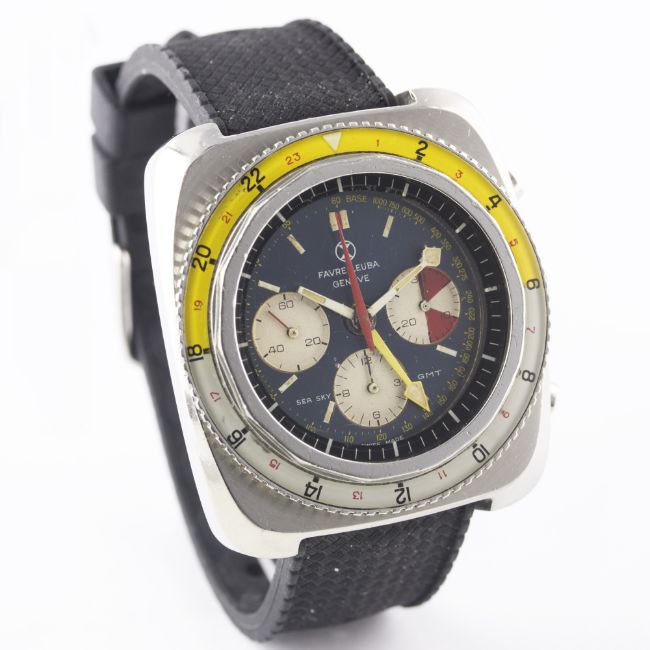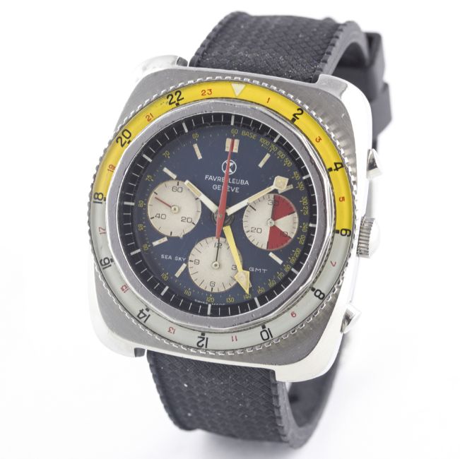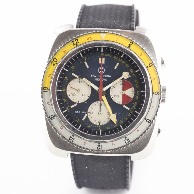 A RARE GENTLEMAN'S STAINLESS STEEL FAVRE LEUBA SEA SKY GMT CHRONOGRAPH WRIST WATCH CIRCA 1960s, REF. 33053  Movement: 17J, manual wind, Valjoux cal. 724, signed Favre-Leuba S.A.Case: Width approx. 43mm, screw back, signed Favre-Leuba Sea Sky GMT with emblem embossed on case back, numbered, 24 hour rotating bakelite bezel, screw-down crown.Strap: Rubber. CONDITION REPORTDial: Original dial in excellent condition, with some slight ageing to the registers.Movement: Working at present.Case: In very good condition, with some small scratches due to general use.Strap/Bracelet: In excellent condition.