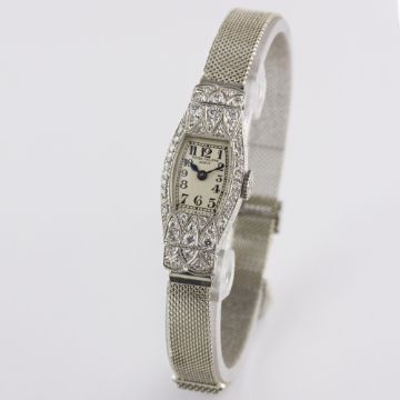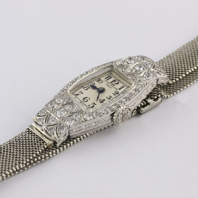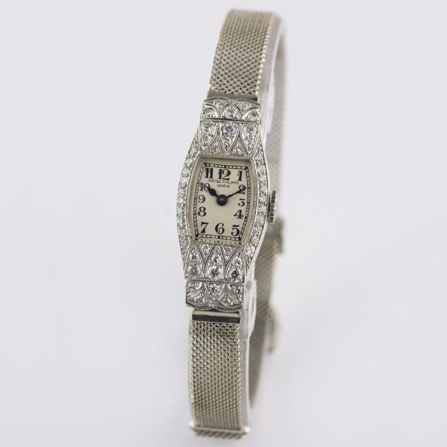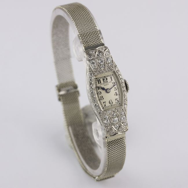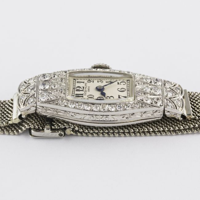 A FINE & RARE LADIES PLATINUM, WHITE GOLD & DIAMOND PATEK PHILIPPE BRACELET WATCH CIRCA 1930s Movement: 18J, manual wind, signed Patek Philippe & Co, numbered. Case: Length inc. lugs approx. 34mm, original diamond set case & swivel lugs, signed Patek Philippe & Co, numbered, Platinum hallmarks.Bracelet: 18k solid white gold mesh bracelet. CONDITION REPORTDial: Dial in excellent condition.Movement: Working at present.Case: In excellent condition.Strap/Bracelet: In very good condition.