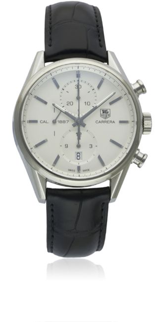 A GENTLEMAN'S STAINLESS STEEL TAG HEUER CARRERA CALIBRE 1887 AUTOMATIC CHRONOGRAPH WRIST WATCH CIRCA 2010, REF. CAR2110-0Movement: 39J, automatic, cal. 1887, signed TAG Heuer.Case: Diameter approx. 40mm, exhibition back, signed, numbered, TAG Heuer crown & pushers.Strap: TAG Heuer leather strap & deployment clasp. CONDITION REPORTDial: Original dial in excellent condition.Movement: Working at present.Case: In excellent condition, with some light scratches due to general use.Strap/Bracelet: In very good condition.