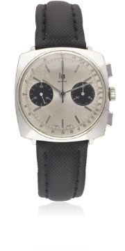 A GENTLEMAN'S CHROME PLATED LIP "TOP TIME" CHRONOGRAPH WRIST WATCH CIRCA 1960s, WITH "PANDA" DIALMovement: 17J, manual wind, Valjoux cal. 7730, signed Lip Geneve. Case: Width approx. 37mm, steel snap back, signed Lip with crest, numbered.Strap: Leather. CONDITION REPORTDial: Original dial in very good condition, showing some signs of age.Movement: Working at present.Case: In good condition, with some light scratches due to general use, some wear to the chrome plating.Strap/Bracelet: In good condition.