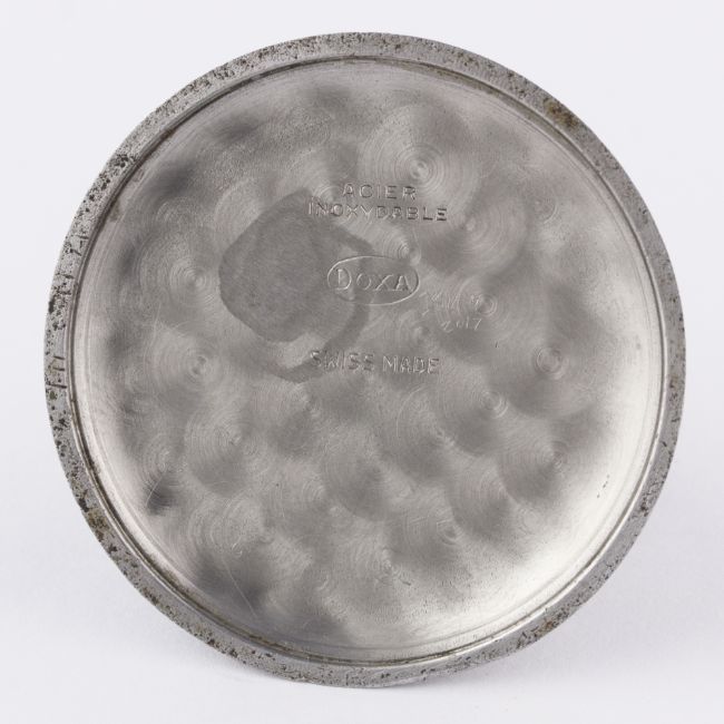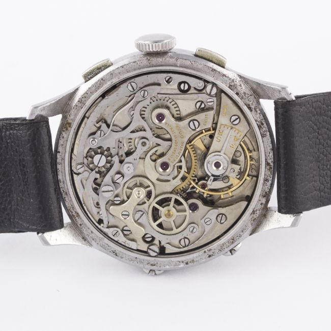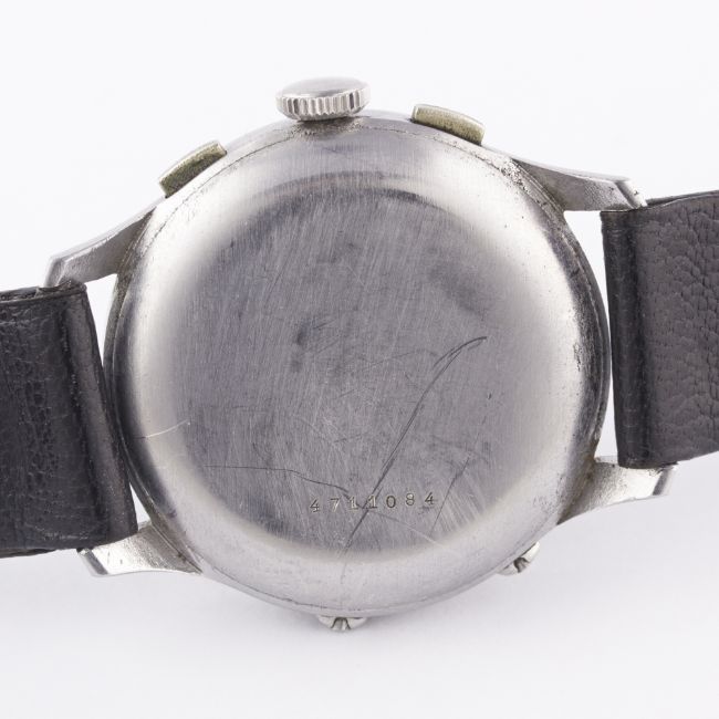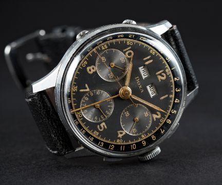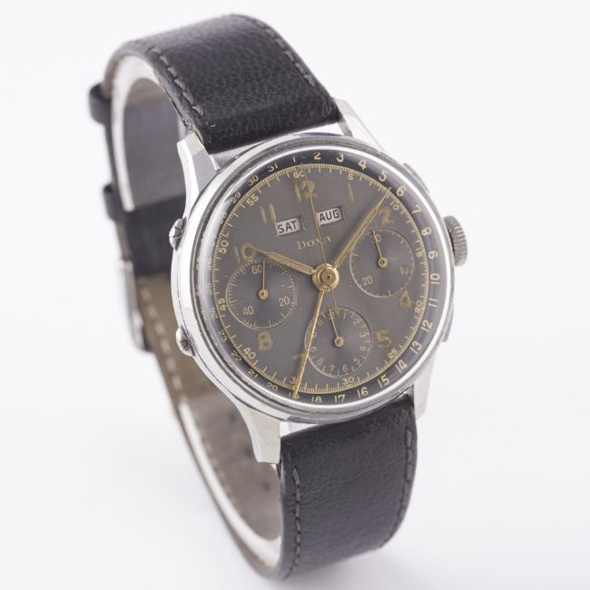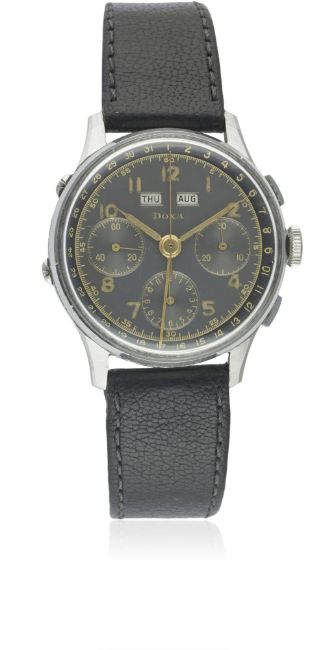 A RARE GENTLEMAN'S STAINLESS STEEL DOXA TRIPLE CALENDAR CHRONOGRAPH WRIST WATCH CIRCA 1940s, WITH GREY & BLACK GILT DIALMovement: 17J, manual wind, signed Doxa.Case: Diameter approx. 35mm, snap back, signed Doxa, numbered.Strap: Leather. CONDITION REPORTDial: Original dial in excellent condition, showing some small signs of age.Movement: Working at present.Case: In very good condition, with some small scratches due to general use.Strap/Bracelet: In very good condition.