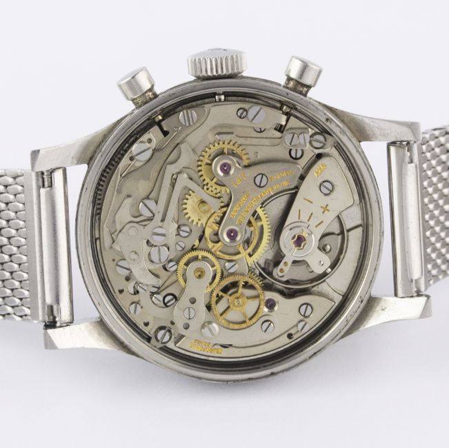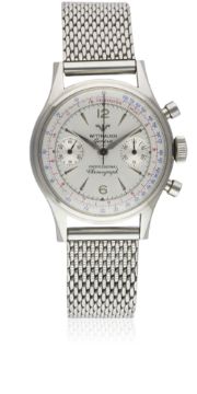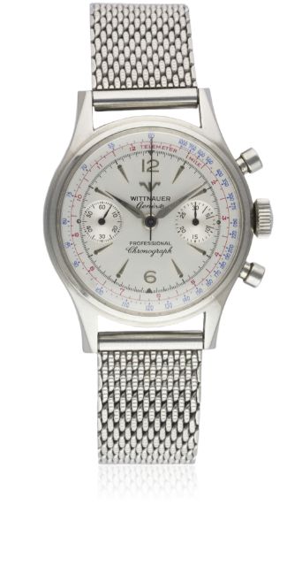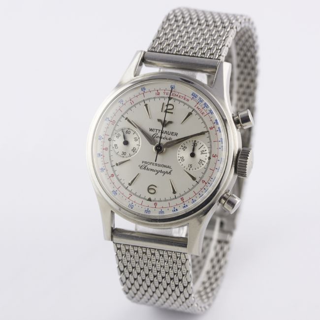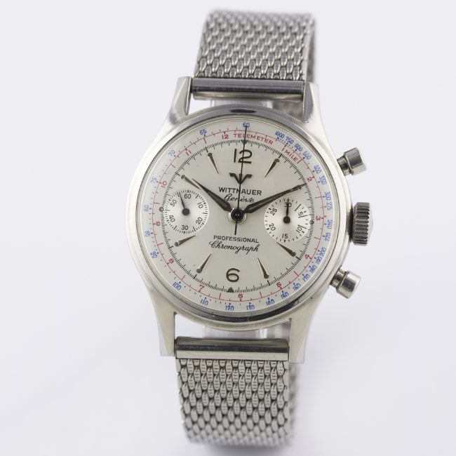 A GENTLEMAN'S STAINLESS STEEL WITTNAUER PROFESSIONAL CHRONOGRAPH BRACELET WATCH CIRCA 1960s, REF. 228TMovement: 17J, manual wind, cal. 14Y, signed Wittnauer Watch Co, numbered.Case: Diameter approx. 35mm, screw back, signed Wittnauer Watch Co, numbered, Wittnauer crown.Bracelet: Mesh. CONDITION REPORTDial: Original dial in excellent condition.Movement: Working at present.Case: In excellent condition, with some light scratches due to general use.Strap/Bracelet: In excellent condition.