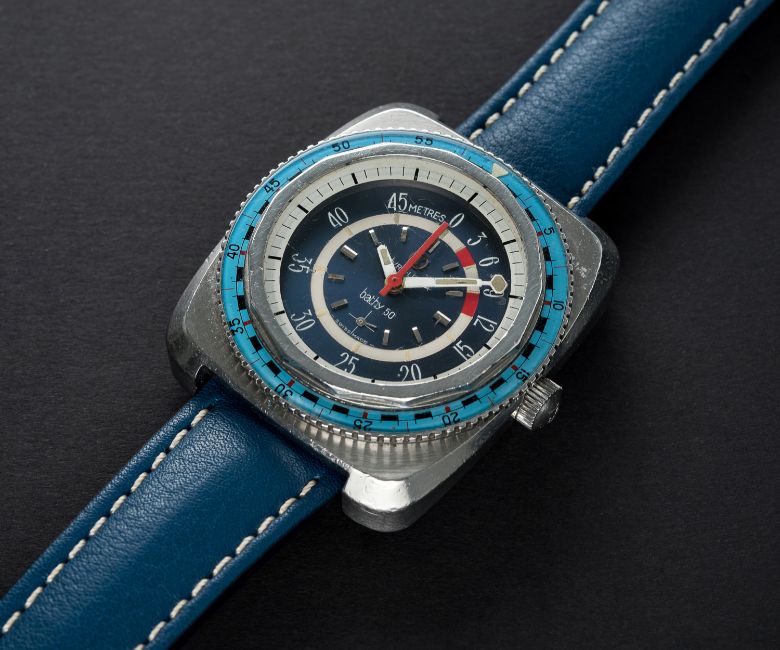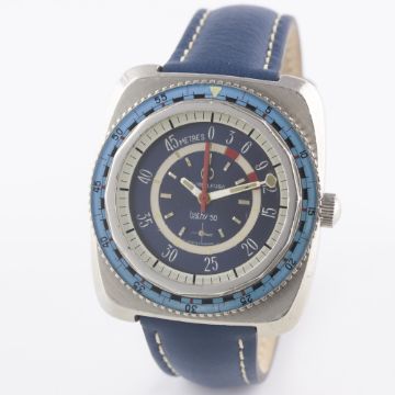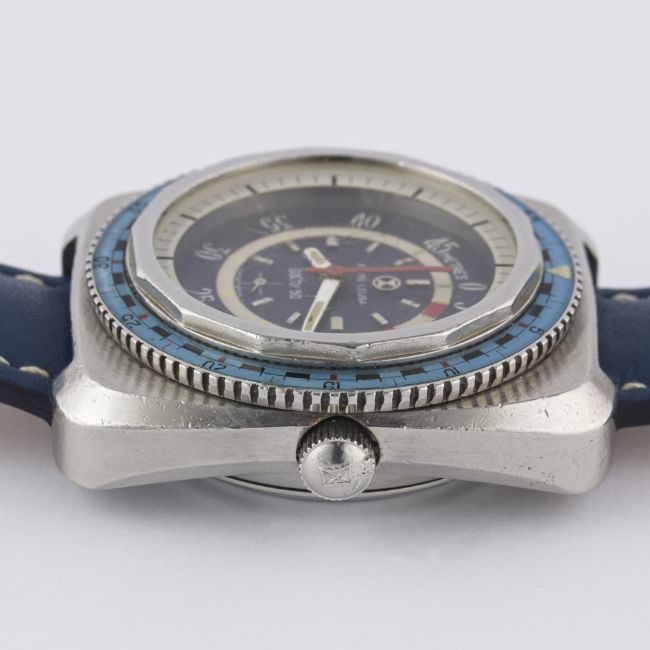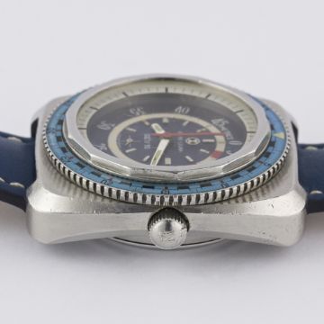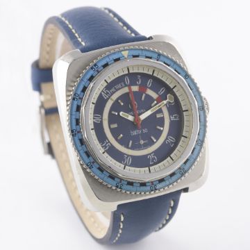 A RARE GENTLEMAN'S STAINLESS STEEL FAVRE LEUBA BATHY 50 DEPTH GAUGE DIVERS WRIST WATCH CIRCA 1968, REF. 53253  Movement: 17J, manual wind, cal. 320, signed Favre-Leuba. Case: Width approx. 43mm, screw back, pressure diaphragm inside allowing for indication of depth rating whilst diving with red hand corresponding to dial, signed Favre-Leuba with emblem embossed on case back, 60 minute rotating bakelite bezel, Favre-Leuba screw-down crown.Strap: Leather. CONDITION REPORTDial: Original dial in excellent condition, showing some very small signs of age.Movement: Working at present.Case: In very good condition, with some small scratches due to general use.Strap/Bracelet: In excellent condition.