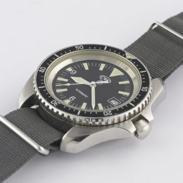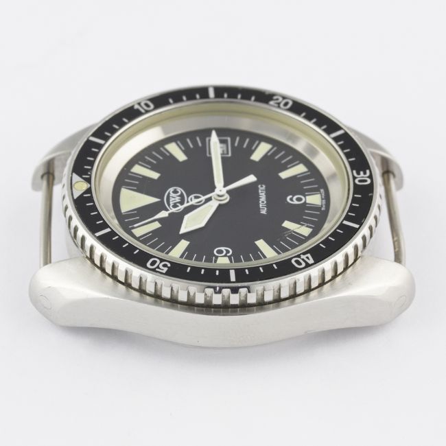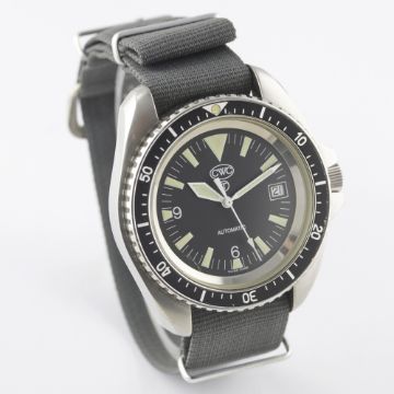 A GENTLEMAN'S STAINLESS STEEL CWC AUTOMATIC DIVERS WRIST WATCH DATED 2002, SOLD BY SILVERMANS TO CIVILIAN & BRITISH MILITARY PERSONNELMovement: 25J, automatic, ETA cal. 2824-2.Case: Diameter approx. 42mm, fixed bars, screw backs marking 6645-99 923-7697 ^ 482/02, 60 minute rotating bezel, dust cover, crown guards, screw-down crown.Strap: NATO. CONDITION REPORTDial: Original dial in excellent condition.Movement: Working at present.Case: In excellent condition, with some light scratches due to use.Strap/Bracelet: In very good condition.