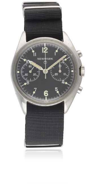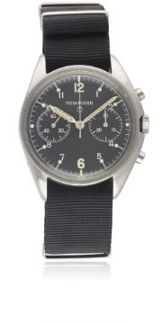A RARE GENTLEMAN'S STAINLESS STEEL BRITISH MILITARY NEWMARK RAF PILOTS CHRONOGRAPH WRIST WATCH DATED 1980, PART OF THE "FAB FOUR"Movement: 17J, manual wind, Valjoux cal. 7733.Case: Diameter approx. 39mm, fixed bars, screw back, numbered, issue markings 6BB/9243306 ^ 309/80. Strap: NATO.    CONDITION REPORTDial: Original dial in excellent condition. Movement: Working at present. Case: In very good condition, with small scratches due to use. Strap/Bracelet: In very good condition.