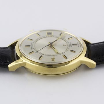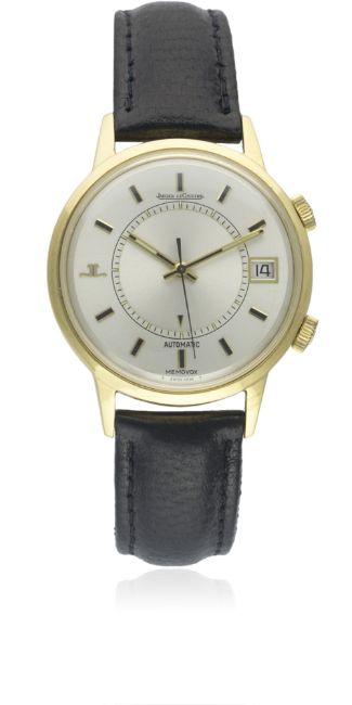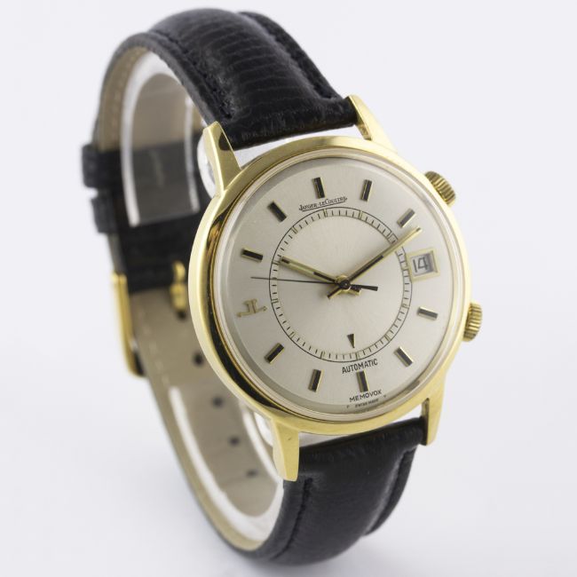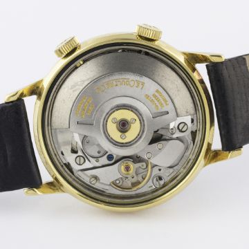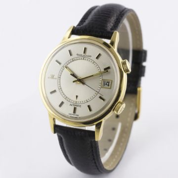 A RARE GENTLEMAN'S 18K SOLID GOLD JAEGER LECOULTRE MEMOVOX SPEED BEAT AUTOMATIC ALARM WRIST WATCHCIRCA 1970Movement: 17J, automatic, cal. 916, signed LeCoultre Co.Case: Diameter approx. 37mm, screw back, signed LC, numbered, 18k hallmarks, JLC crowns.Strap: Leather. CONDITION REPORTDial: Original dial in excellent condition.Movement: Working at present.Case: In very good condition, case back engraving showing some wear due to general use.Strap/Bracelet: In excellent condition.
