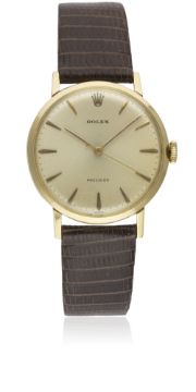 A GENTLEMAN'S 18K SOLID GOLD ROLEX PRECISION WRIST WATCHCIRCA 1960s, REF. 9708Movement: 17J, manual wind, cal. 1210, signed Montres Rolex S.A., numbered.Case: Diameter approx. 34mm, Rolex coronet engraved on case back, signed Montres Rolex S.A., numbered, 18k hallmarks. Strap: Leather. CONDITION REPORTDial: Original dial in very good condition, showing some small signs of age.Movement: Working at present.Case: In excellent condition, with some light scratches due to general use.Strap/Bracelet: In excellent condition.