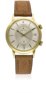 A RARE GENTLEMAN'S 18K SOLID GOLD GUBELIN IPSOVOX AUTOMATIC ALARM WRIST WATCHCIRCA 1960sMovement: "Bumper" automatic, signed, numbered.Case: Diameter approx. 37mm, two-part case back, signed, numbered, 18k hallmarks, JLC crowns.Strap: Leather. CONDITION REPORTDial: Original dial in excellent condition.Movement: Working at present.Case: In very good condition, with some light scratches due to general use.Strap/Bracelet: In excellent condition.