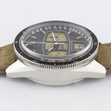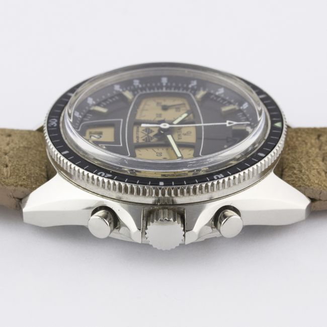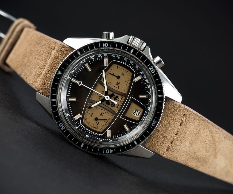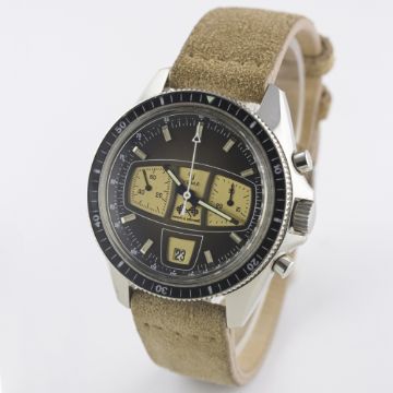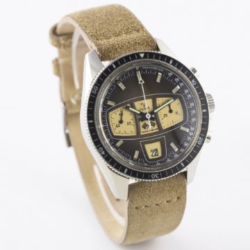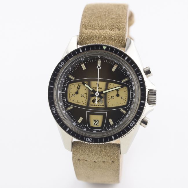 A VERY RARE GENTLEMAN'S STAINLESS STEEL YEMA RALLYE "BROWN SUGAR" CHRONOGRAPH WRIST WATCH CIRCA 1970Movement: 17J, manual wind, Valjoux cal. 7734.Case: Diameter approx. 41mm, screw back, crown guards, ref. 850737, signed Yema with crest, numbered, 60 minute rotating bakelite bezel.Strap: Suede. CONDITION REPORTDial: Original dial in excellent condition.Movement: Working at present.Case: In excellent condition.Strap/Bracelet: In excellent condition.