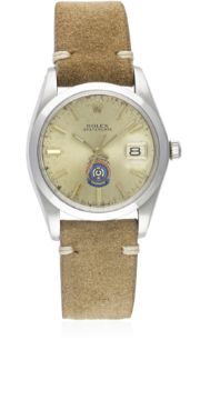 A RARE GENTLEMAN'S STAINLESS STEEL ROLEX OYSTERDATE PRECISION WRIST WATCHCIRCA 1975, REF. 6694 COMMISSIONED BY THE UAE MILITARY AIR FORCE Movement: 17J, manual wind, cal. 1225, signed Montres Rolex S.A., numbered.Case: Diameter approx. 35mm, Oyster case, signed Montres Rolex S.A., numbered, Rolex crown.Strap: Suede. CONDITION REPORTDial: Original dial in good condition, showing signs of age.Movement: Working at present.Case: In excellent condition, with some light scratches due to general use.Strap/Bracelet: In very good condition.