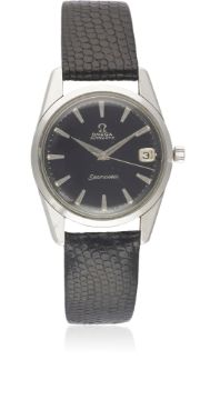 A GENTLEMAN'S STAINLESS STEEL OMEGA SEAMASTER AUTOMATIC WRIST WATCH CIRCA 1963, WITH GLOSS BLACK DIALMovement: 24J, automatic, cal. 562, signed Omega Watch Co, numbered. Case: Diameter approx. 34mm, screw back, Seamaster emblem embossed on case back, Omega crown.Strap: Leather. CONDITION REPORTDial: Original dial in excellent condition, showing some very small signs of age.Movement: Working at present.Case: In very good condition, with light scratches due to general use.Strap/Bracelet: In excellent condition.