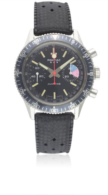 A GENTLEMAN'S STAINLESS STEEL PONTIAC JUMPING CHRONOGRAPH WRIST WATCH CIRCA 1970sMovement: 17J, manual wind, Valjoux cal. 7733.Case: Diameter approx. 38mm, screw back, numbered, MH rotating bezel. Strap: Rubber Tropic. CONDITION REPORTDial: Original dial in excellent condition, showing some small signs of age.Movement: Working at present.Case: In very good condition, with some light scratches due to general use.Strap/Bracelet: In excellent condition.