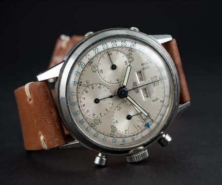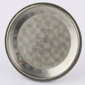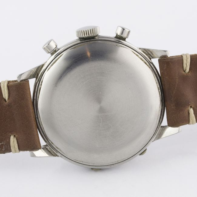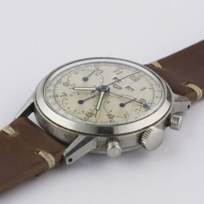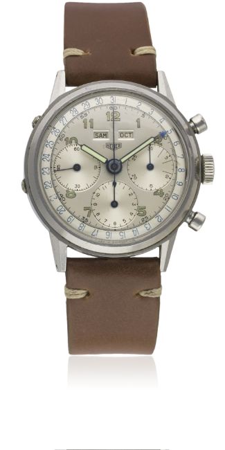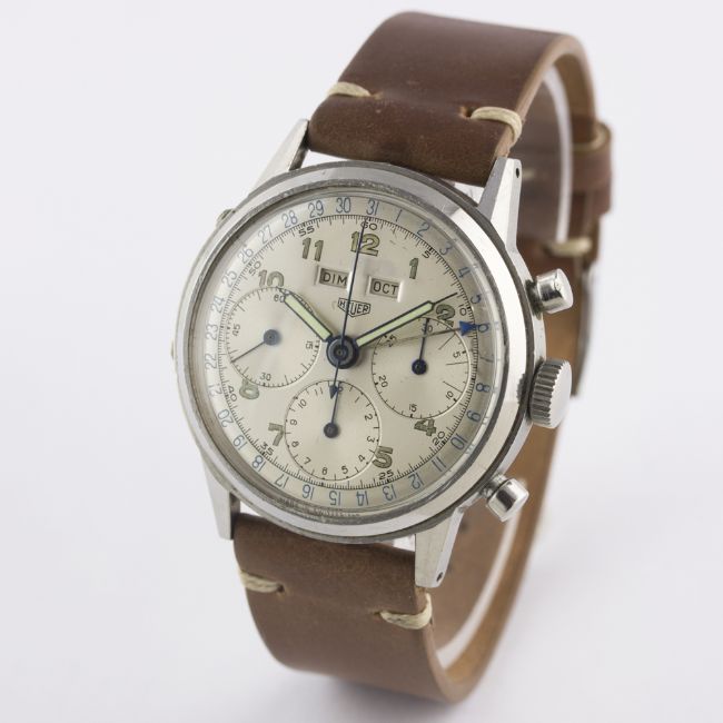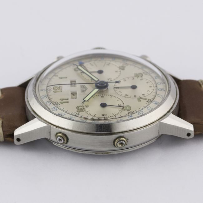 A VERY RARE GENTLEMAN'S LARGE SIZE STAINLESS STEEL HEUER TRIPLE CALENDAR CHRONOGRAPH WRIST WATCH CIRCA 1940s Movement: 17J, manual wind, Valjoux cal. 72c, signed Ed. Heuer & Co., numbered. Case: Diameter approx. 38mm, screw back, signed Ed. Heuer & Co, numbered. Strap: Horween leather. CONDITION REPORTDial: Original dial in excellent condition, showing some signs of age.Movement: Working at present.Case: In excellent condition, with light scratches due to general use.Strap/Bracelet: In excellent condition.