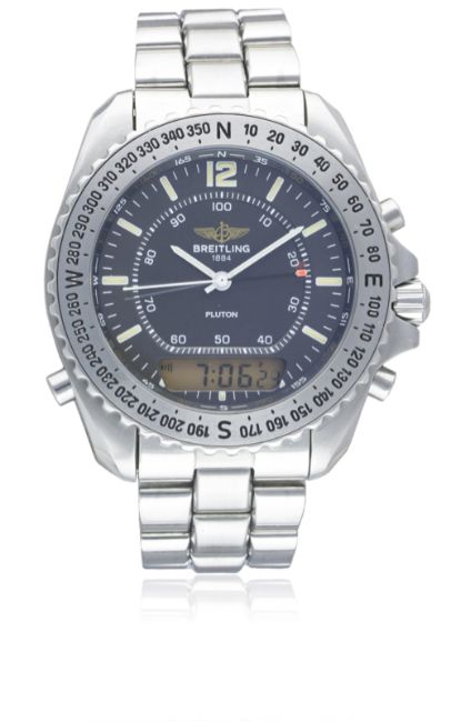 A GENTLEMAN'S STAINLESS STEEL BREITLING PLUTON BRACELET WATCH CIRCA 1990s, REF. A51038Movement: Quartz, signed Breitling. Case: Diameter approx. 41mm, screw back, signed Breitling, numbered, navigational rotating bezel, Breitling crown.Bracelet: Original Breitling stainless steel bracelet. CONDITION REPORTDial: Original dial in excellent condition.Movement: Working at present.Case: In excellent condition, with some light scratches due to general use.Strap/Bracelet: In excellent condition, with some light scratches due to general use.