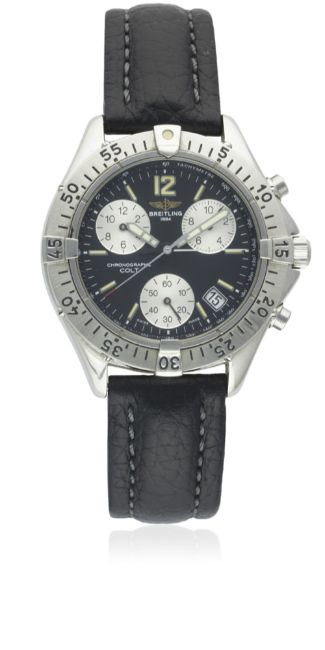 A GENTLEMAN'S STAINLESS STEEL BREITLING COLT CHRONOGRAPH WRIST WATCH CIRCA 1990s, REF. A53035Movement: Quartz, signed Breitling. Case: Diameter approx. 38mm, screw back, signed Breitling, numbered, 60 minute rotating bezel, Breitling crown.Strap: Leather strap with Breitling pin buckle. CONDITION REPORTDial: Original dial in excellent condition.Movement: Working at present.Case: In excellent condition, with some light scratches due to general use.Strap/Bracelet: In very good condition.