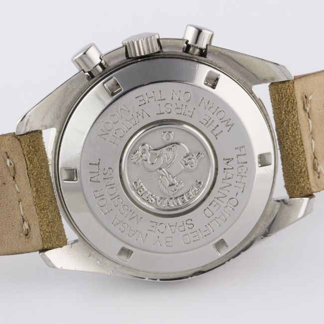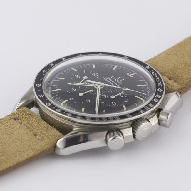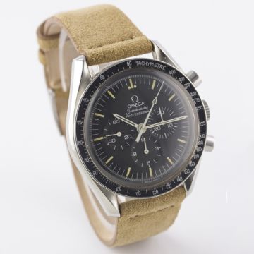 A GENTLEMAN'S STAINLESS STEEL OMEGA SPEEDMASTER PROFESSIONAL CHRONOGRAPH WRIST WATCH CIRCA 1978, REF. ST 145022 78Movement: 17J, manual wind, cal. 861, signed Omega, numbered. Case: Diameter approx. 42mm, screw back, Speedmaster emblem embossed with NASA moon landing tribute, signed Omega Watch Co, dust cover, tachymetre bezel, Omega crown.Strap: Suede. CONDITION REPORTDial: Original dial in excellent condition.Movement: Working at present.Case: In very good condition.Strap/Bracelet: In excellent condition.