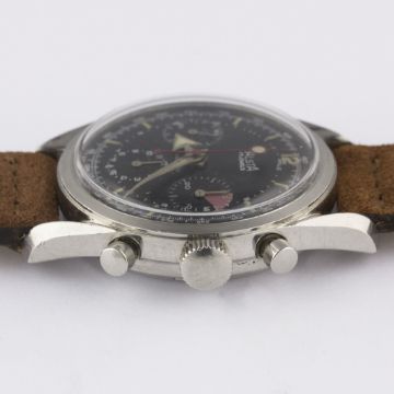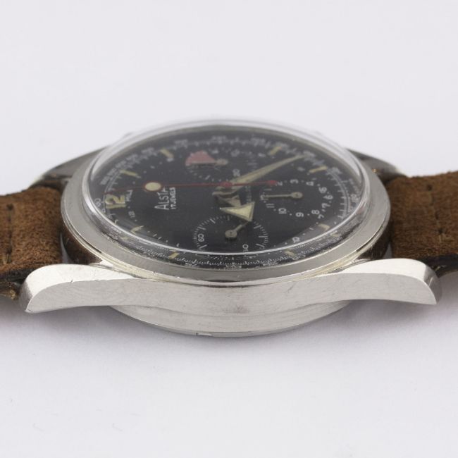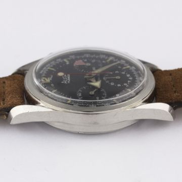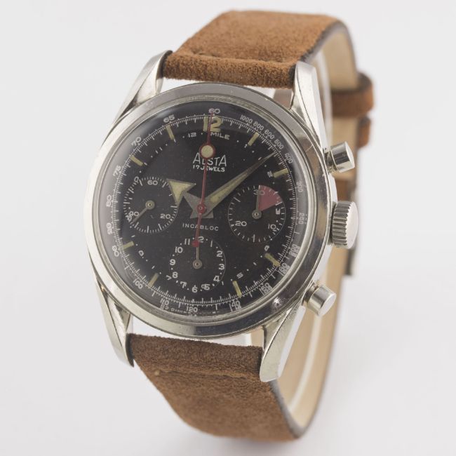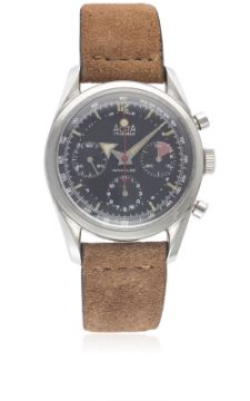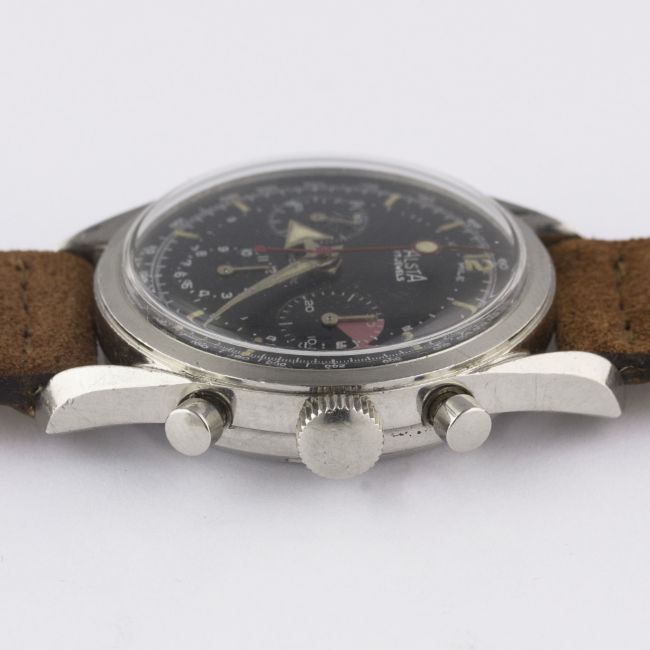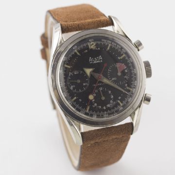 A RARE GENTLEMAN'S STAINLESS STEEL ALSTA CHRONOGRAPH WRIST WATCH CIRCA 1960s, WITH "BROAD ARROW" HANDSMovement: 17J, manual wind, Valjoux cal. 72, signed JP Pingouin Co.Case: Diameter approx. 37mm, screw back, signed J.P Pingouin Co, "bombe" lugs.Strap: Suede JPM.    CONDITION REPORTDial: Original dial in excellent condition. Movement: Working at present. Case: In excellent condition, with some small scratches due to general use. Strap/Bracelet: In excellent condition.