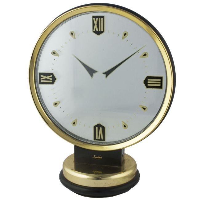 A RARE GILT METAL & BLACK LACQUERED SMITHS MYSTERY CLOCK CIRCA 1950s, WITH JAEGER BREVETE PATENTSMovement: Electric, signed Smiths Made in EnglandCase: Diameter approx. 19cm, height approx. 23.5cm, signed Smiths & Jaeger, numbered. CONDITION REPORTDial: Original dial in excellent condition.Movement: Working at present.Case: In excellent condition, with some light scratches due to general use.