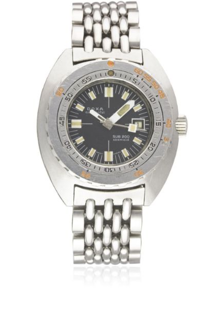 A RARE LADIES STAINLESS STEEL DOXA SUB 200 SEAMAID AUTOMATIC DIVERS BRACELET WATCH CIRCA 1970sMovement: Automatic, cal. 7 3/4-89, signed Doxa S.A. Case: Width approx. 33mm, screw back, ship emblem embossed on case back, signed Doxa S.A, 60 minute & no-decompression limit bezel, Doxa crown.Bracelet: Original Doxa Sub 300 expanding "beads of rice" bracelet, end links numbered 7616-1. CONDITION REPORTDial: Original dial in excellent condition.Movement: Working at present.Case: In excellent condition, with some small scratches due to general use.Strap/Bracelet: In excellent condition, with light scratches due to general use.