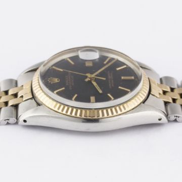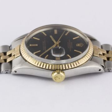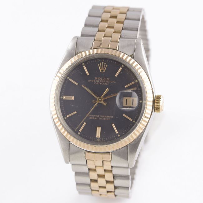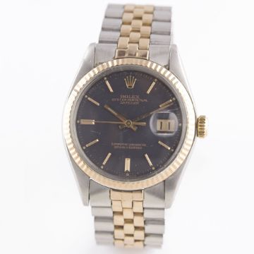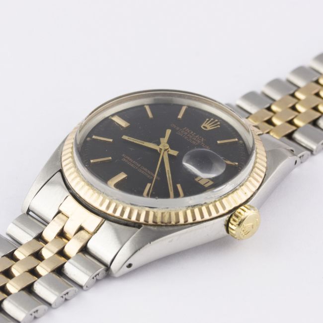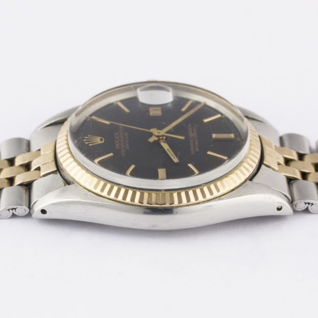 A RARE GENTLEMAN'S STEEL & PINK GOLD ROLEX OYSTER PERPETUAL DATEJUST BRACELET WATCHCIRCA 1972, REF. 1601 WITH MATT BLACK SIGMA DIAL Movement: 26J, automatic chronometer, cal. 1570, signed Montres Rolex S.A., numbered.Case: Diameter approx. 36mm, Oyster case, signed Montres Rolex S.A., numbered, solid pink gold fluted bezel, Rolex crown.Bracelet: Rolex Jubilee steel & solid pink gold bracelet, numbered 6252H14/255 R. CONDITION REPORTDial: Original dial in excellent condition.Movement: Working at present.Case: In very good condition, with some small scratches due to general use.Strap/Bracelet: In very good condition, with scratches due to general use.