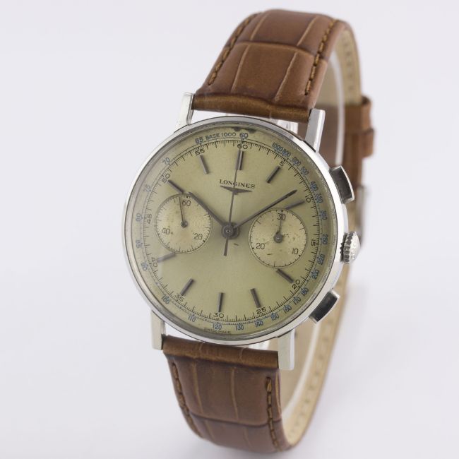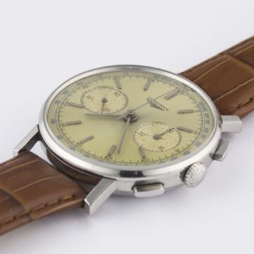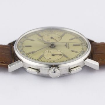 A GENTLEMAN'S STAINLESS STEEL LONGINES FLYBACK CHRONOGRAPH WRIST WATCHDATED 1964, REF. 7414 WITH LONGINES EXTRACT FROM THE ARCHIVESMovement: 18J, manual wind, cal. 30CH, signed Longines, numbered.Case: Diameter approx. 36mm, snap back, signed Longines, numbered, Longines crown.Strap: Leather. CONDITION REPORTDial: Original dial in good condition, showing signs of age.Movement: Working at present.Case: In excellent condition, with some light scratches due to general use.Strap/Bracelet: In excellent condition.