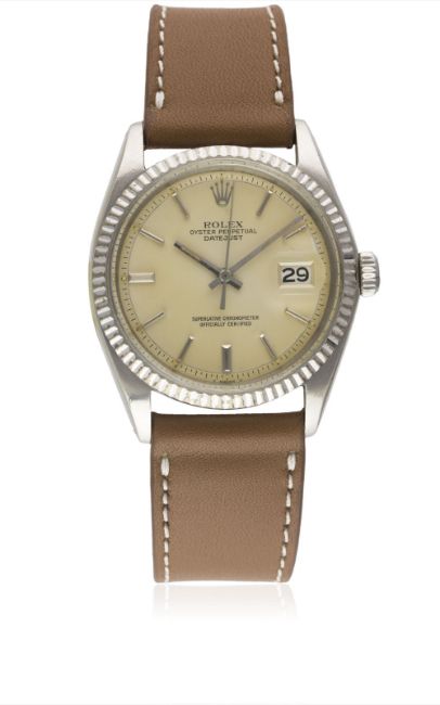 A GENTLEMAN'S STEEL & WHITE GOLD ROLEX OYSTER PERPETUAL DATEJUST WRIST WATCHCIRCA 1978, REF. 1601Movement: 26J, automatic chronometer, cal. 1570, signed Montres Rolex S.A., numbered.Case: Diameter approx. 36mm, Oyster case, signed Montres Rolex S.A., numbered, solid white gold fluted bezel, Rolex crown.Strap: Leather. CONDITION REPORTDial: Original dial in excellent condition, showing a light "champagne" patina, with some small signs of age.Movement: Working at present.Case: In excellent condition, with small scratches due to general use.Strap/Bracelet: In excellent condition.