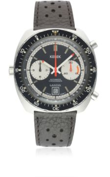 AN EXTREMELY RARE GENTLEMAN'S STAINLESS STEEL KELEK "CALIBRE 12" AUTOMATIC CHRONOGRAPH WRIST WATCH DATED 1976, PRESENTED TO LANCIA TECHNICAL ENGINEER NICOLA MATERAZZI IN 1976 FOR THEIR VICTORIOUS WORLD RALLY CHAMPIONSHIP WITH THE LANCIA STRATOS, A CAR WHICH HE WAS INSTRUMENTAL IN THE DESIGN OF AND ONE THAT WENT ON TO BECOME ONE OF THE MOST ICONIC CARS OF THE PERIOD Movement: 17J, automatic, Buren "cal. 12", signed JRGK.Case: Width approx. 43mm, screw back, presentational inscription to case back 'Lancia Stratos Campione del Mondo 1976 Ing. Nicola Materazzi, numbered, 60 minute rotating bezel.Strap: Perforated leather. Nicola Materazzi was technical engineer for Lancia and was instrumental in the design of the World Rally specification Lancia Stratos cars. This watch was presented to him for their World Rally Championship win in 1976. Upon leaving Lancia and after a short spell for Osella working on Formula 1 & 2 cars, he was hired in 1979 by Ferrari as head of the racing department technical office. He oversaw the technical development of various Ferrari cars including the GTO, Testarossa, 288 GTO Evolution, 412 GT, 328 and 208 Turbo. Perhaps his most impressive project was the iconic Ferrari F40, for which he oversaw the whole design. Upon leaving Ferrari after over 10 years of service, he worked on various other projects including the Bugatti EB110 in 1991. He worked on 38 projects in his illustrious career.  CONDITION REPORTDial: Original dial in excellent condition.Movement: Working at present.Case: In excellent condition, with some light scratches due to general use.Strap/Bracelet: In excellent condition.