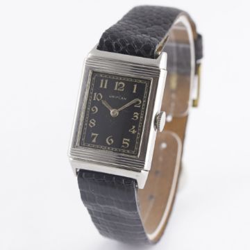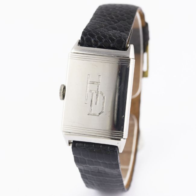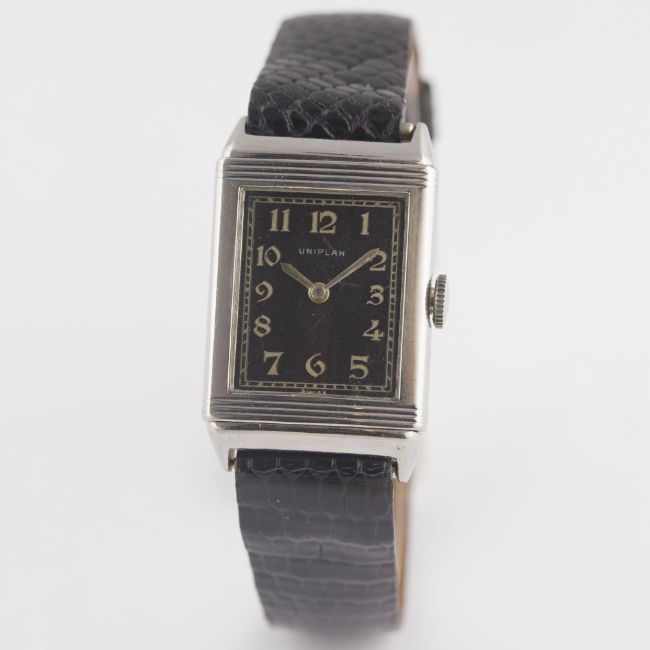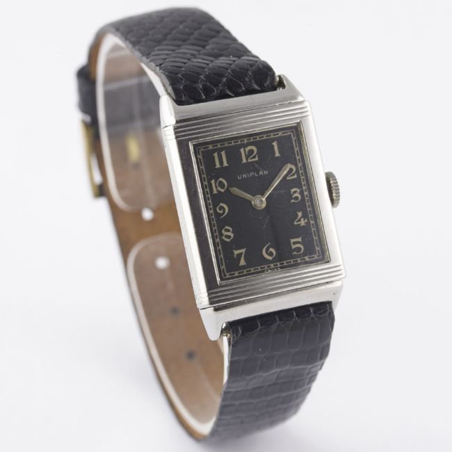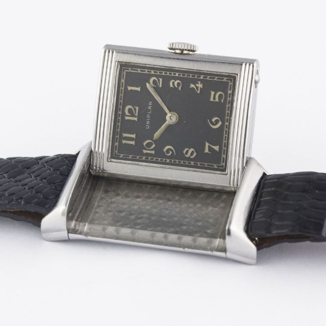 A RARE GENTLEMAN'S STAINLESS STEEL UNIPLAN REVERSO WRIST WATCHCIRCA 1930s, PRE JAEGER-LECOULTREMovement: 15J, manual wind, cal. 064, numbered.Case: Measures approx. 37mm by 23mm, reverse side engraved with Art Deco initials HD, numbered. Strap: Leather. CONDITION REPORTDial: Dial in excellent condition.Movement: Working at present.Case: In excellent condition, with some light scratches due to general use.Strap/Bracelet: In excellent condition.