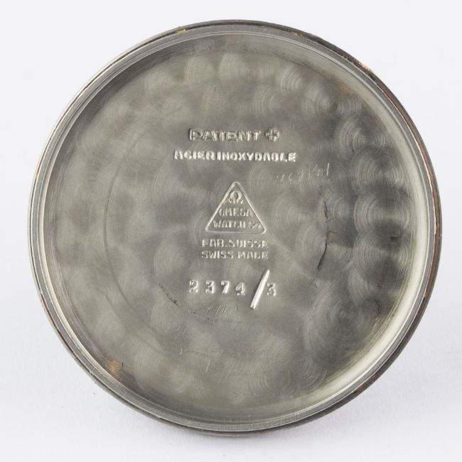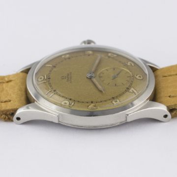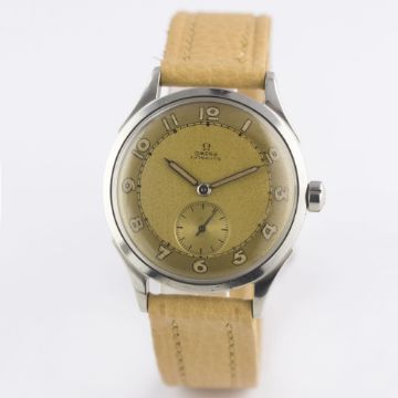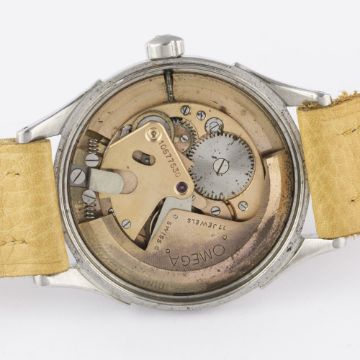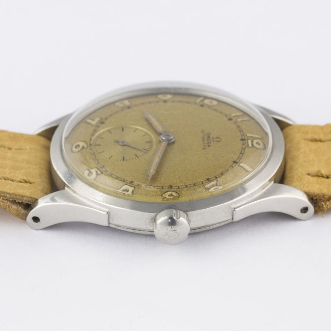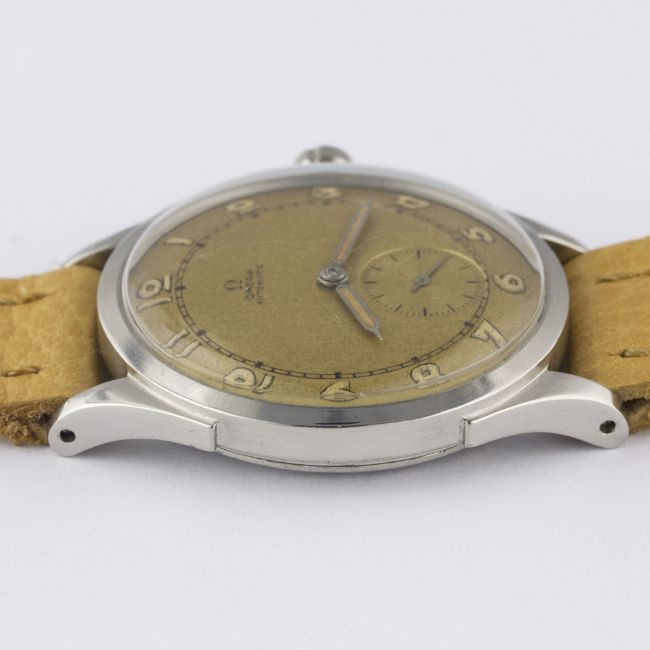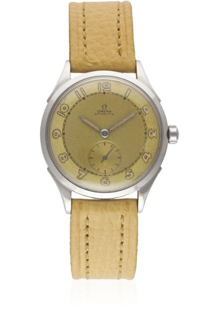 A GENTLEMAN'S STAINLESS STEEL OMEGA AUTOMATIC WRIST WATCH CIRCA 1952, REF. 2374/3 WITH "HONEY" PATINA DIALMovement: 17J, "bumper" automatic, cal. 30.10 R.A. PC, signed Omega, numbered. Case: Diameter approx. 35mm, two part case back, signed Omega Watch Co, patent mark, Omega crown.Strap: Leather. CONDITION REPORTDial: Original dial in very good condition, showing a strong "honey" patina.Movement: Working at present.Case: In excellent condition, with some light scratches due to general use.Strap/Bracelet: In very good condition.