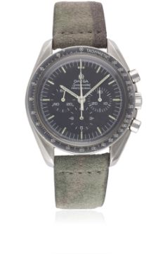 A GENTLEMAN'S STAINLESS STEEL OMEGA SPEEDMASTER PROFESSIONAL CHRONOGRAPH WRIST WATCH CIRCA 1973, REF. 145022-71 STMovement: 17J, manual wind, cal. 861, signed Omega, numbered. Case: Diameter approx. 42mm, screw back, Speedmaster emblem embossed with NASA moon landing tribute, signed Omega Watch Co, dust cover, tachymetre bezel faded to grey, Omega crown.Strap: Suede. CONDITION REPORTDial: Original dial in excellent condition, showing some small signs of age.Movement: Working at present.Case: In excellent condition, with some small scratches due to general use, some light wear to bezel.Strap/Bracelet: In excellent condition.