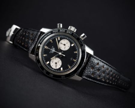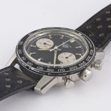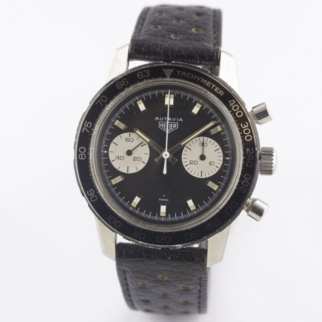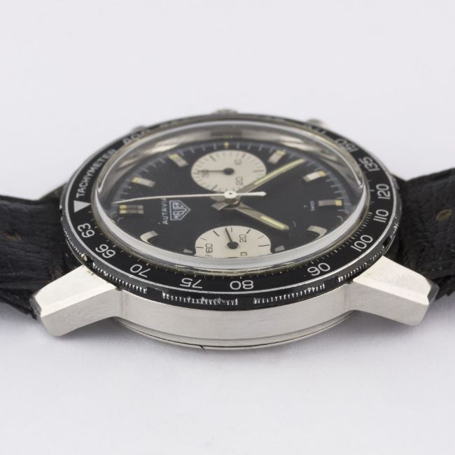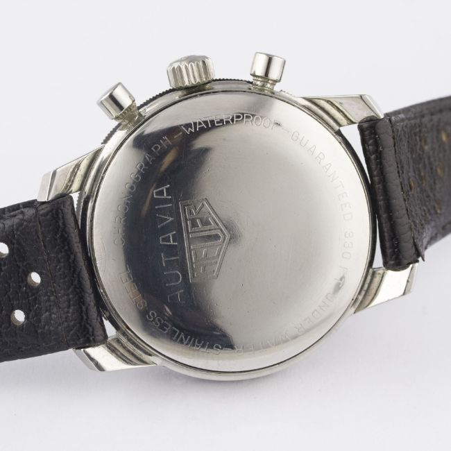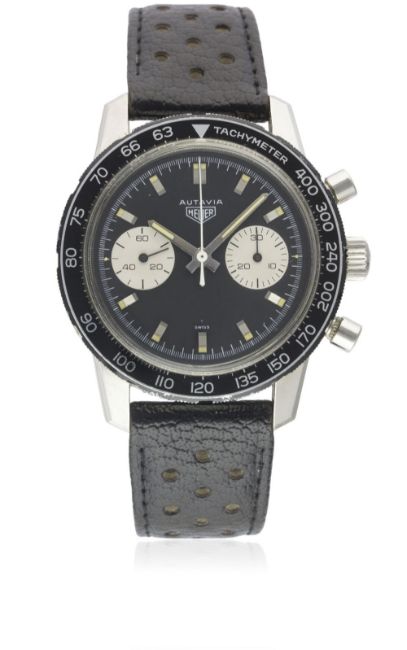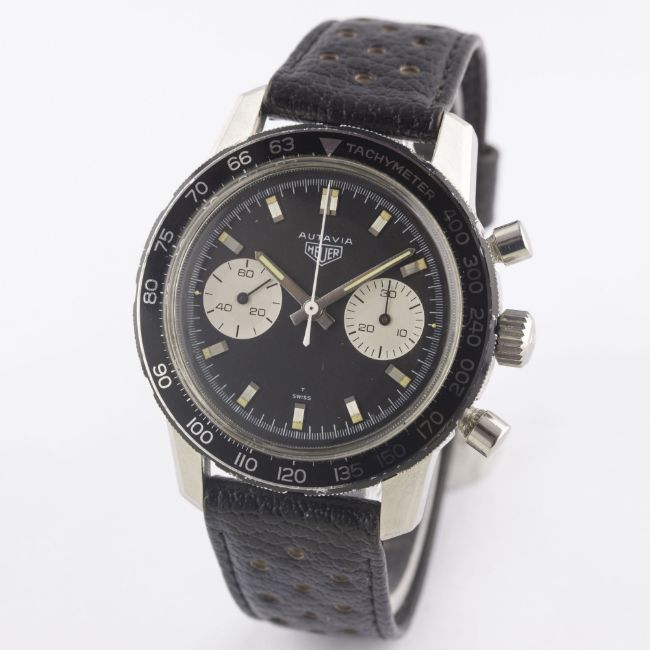 A RARE GENTLEMAN'S STAINLESS STEEL HEUER AUTAVIA CHRONOGRAPH WRIST WATCH  CIRCA 1970, REF. 7763CMovement: 17J, manual wind, Valjoux cal. 7730, signed Heuer-Leonidas S.A. Case: Diameter approx. 41mm, compressor type, signed Heuer-Leonidas S.A, signed Heuer Autavia on case back, numbered, rotating tachymetre bezel, Heuer crown.Strap: Original perforated leather strap with re-edition Heuer pin buckle. CONDITION REPORTDial: Original dial in excellent condition, luminous showing a nice patina.Movement: Working at present.Case: In excellent condition.Strap/Bracelet: In excellent condition.