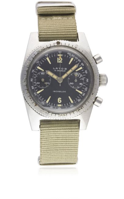 A GENTLEMAN'S STAINLESS STEEL LATOR DIVERS CHRONOGRAPH WRIST WATCH CIRCA 1960sMovement: 17J, manual wind, Landeron cal. 248.Case: Diameter approx. 37mm, screw back, 60 minute rotating bezel.Strap: NATO. CONDITION REPORTDial: Original dial in excellent condition.Movement: Working at present.Case: In excellent condition, with some light scratches due to general use.Strap/Bracelet: New.