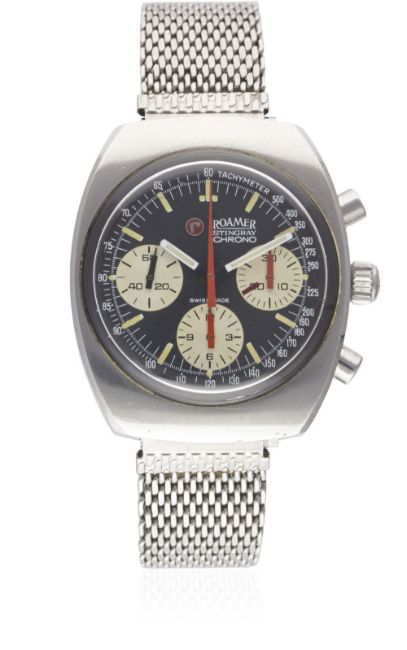 A RARE GENTLEMAN'S STAINLESS STEEL ROAMER STINGRAY CHRONO CHRONOGRAPH BRACELET WATCH CIRCA 1970, REF. 072-9120.602 AS WORN BY THE VICTORIOUS BJÖRN WALDEGÅRD IN BOTH THE 1969 AND 1970 AUTO RALLY OF MONTE CARLOMovement: 17J, manual wind, Valjoux cal. 72, signed Roamer. Case: Width approx. 37mm, "modular" case, Stingray emblem embossed on case back, signed Roamer, numbered, Roamer crown & plexiglass.Bracelet: Unsigned mesh bracelet. CONDITION REPORTDial: Original dial in excellent condition.Movement: Working at present.Case: In excellent condition, with some small scratches due to general use.Strap/Bracelet: In excellent condition, with some light scratches due to general use.