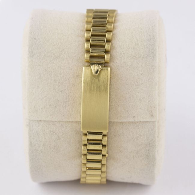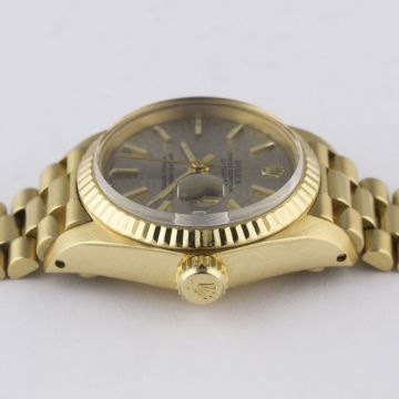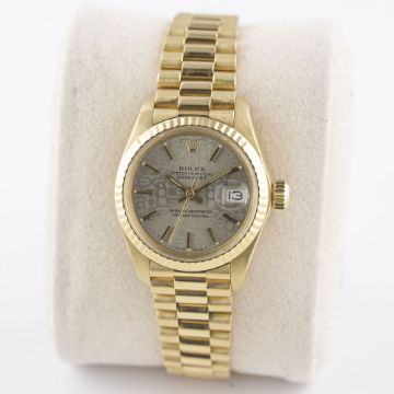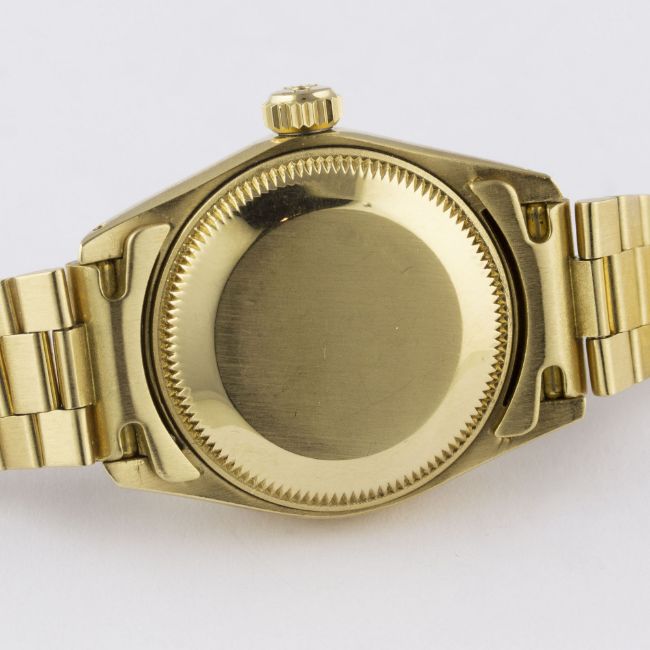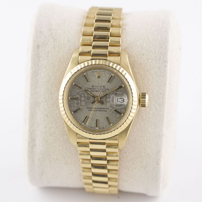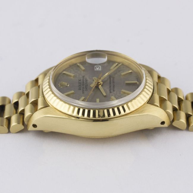 A LADIES 18K SOLID GOLD ROLEX OYSTER PERPETUAL DATEJUST BRACELET WATCHCIRCA 1980, REF. 6917 WITH GREY JUBILEE DIALMovement: 28J, automatic chronometer, cal. 2030, signed Rolex S.A., numbered.Case: Diameter approx. 26mm, Oyster case, signed Montres Rolex S.A., numbered, fluted bezel, Rolex crown.Bracelet: Original 18k solid gold Rolex President bracelet. CONDITION REPORTDial: Original dial in excellent condition.Movement: Working at present.Case: In excellent condition.Strap/Bracelet: In excellent condition, with some light stretch of the links due to general use.