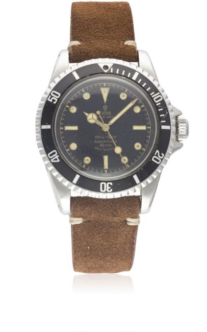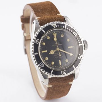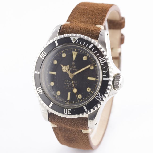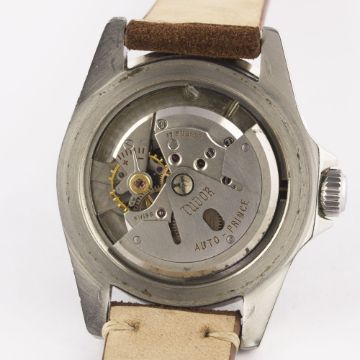 A VERY RARE GENTLEMAN'S STAINLESS STEEL ROLEX TUDOR OYSTER PRINCE SUBMARINER WRIST WATCHCIRCA 1962, REF. 7928 PCG WITH GILT CHAPTER RING EXCLAMATION POINT DIAL Movement: 17J, automatic, "butterfly" rotor, signed Tudor Auto-Prince.Case: Diameter approx. 40mm, Oyster case, pointed crown guards, signed Montres Tudor S.A., dated II.61, numbered, 60 minute rotating bezel, Rolex crown.Strap: Suede. CONDITION REPORTDial: Original dial in excellent condition, showing some very small signs of age.Movement: Working at present.Case: In excellent condition, with some small scratches due to general use.Strap/Bracelet: In excellent condition.