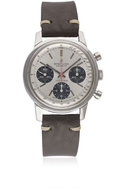 A RARE GENTLEMAN'S STAINLESS STEEL BREITLING TOP TIME CHRONOGRAPH WRIST WATCH CIRCA 1969, REF. 810 WITH "PANDA" DIAL Movement: 17J, manual wind, Venus cal. 178, signed Breitling Watch Ltd. Case: Diameter approx. 38mm, snap back, signed Breitling, numbered, Breitling crown.Strap: Leather. CONDITION REPORTDial: Original dial in excellent condition, showing some very small signs of age.Movement: Working at present.Case: In excellent condition, with some light scratches due to general use.Strap/Bracelet: In excellent condition.