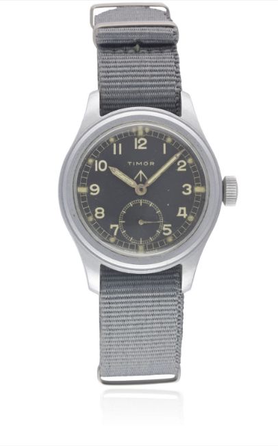 A GENTLEMAN'S STAINLESS STEEL BRITISH MILITARY TIMOR W.W.W. WRIST WATCH CIRCA 1940s, PART OF THE "DIRTY DOZEN"Movement: 15J, manual wind, cal. 6060, signed Timor.Case: Diameter approx. 36mm, fixed bars, screw back, issue markings TIMOR ^ W.W.W. K 918 30818, dust cover.Strap: NATO. CONDITION REPORTDial: Original dial in excellent condition, showing some small signs of age.Movement: Working at present.Case: In excellent condition, with some light scratches due to use.Strap/Bracelet: In excellent condition.