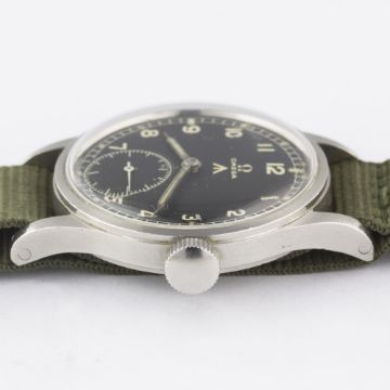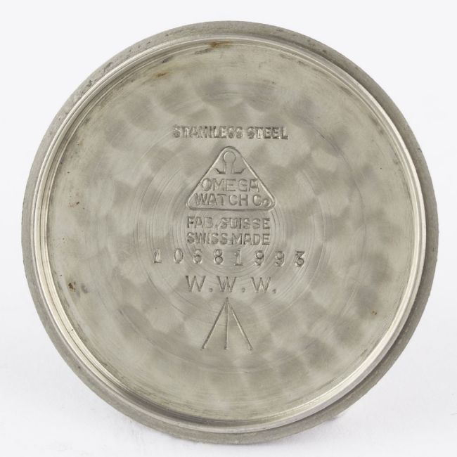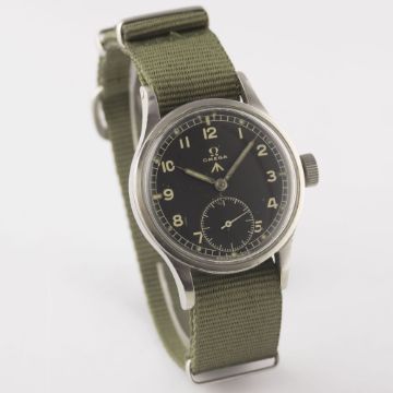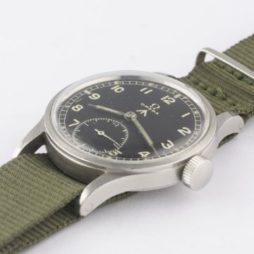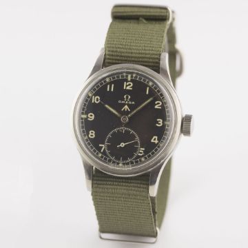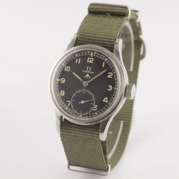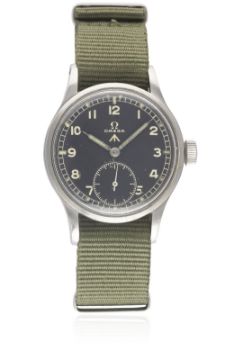 A GENTLEMAN'S STAINLESS STEEL BRITISH MILITARY OMEGA W.W.W. WRIST WATCH CIRCA 1940s, PART OF THE "DIRTY DOZEN", WITH ATP REISSUE MARKINGSMovement: 15J, manual wind, cal. 30T2, signed Omega, numbered.Case: Diameter approx. 35mm, fixed bars, screw back, signed Omega Watch Co, issue markings ATP (W.W.W. crossed out) ^ Y17794 10681993.Strap: NATO. CONDITION REPORTDial: Original dial in very good condition, with some marks to the surface.Movement: Working at present.Case: In very good condition, with small scratches due to use.Strap/Bracelet: In excellent condition.