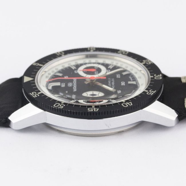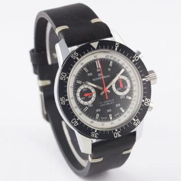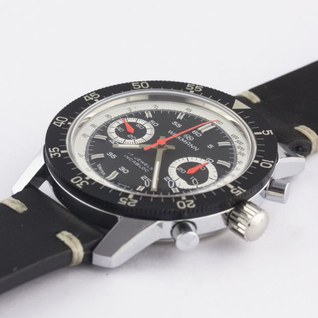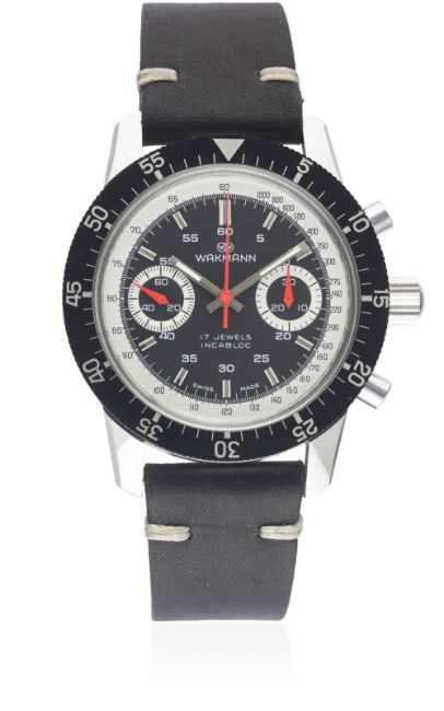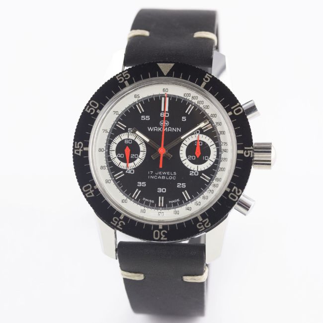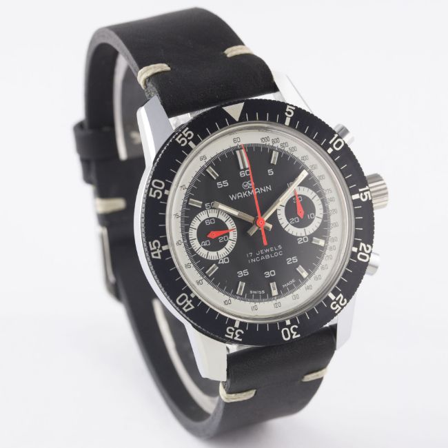 A RARE GENTLEMAN'S "NOS" WAKMANN "BIG BOY" CHRONOGRAPH WRIST WATCH CIRCA 1970 Movement: 17J, manual wind, Valjoux cal. 236, signed Ch. Gigandet.Case: Diameter approx. 40mm, chrome plated, steel screw back, signed Charles Gigandet, numbered, 60 minute rotating bezel, screw-down crown.Strap: Leather. CONDITION REPORTDial: Original dial in excellent condition.Movement: Working at present.Case: In excellent condition.Strap/Bracelet: In excellent condition.The watch looks to be in "new old stock" condition.