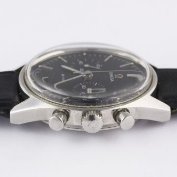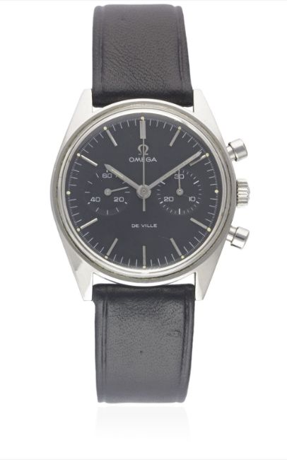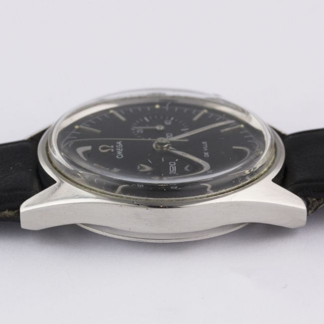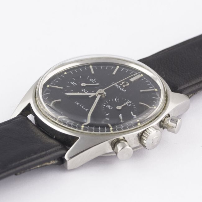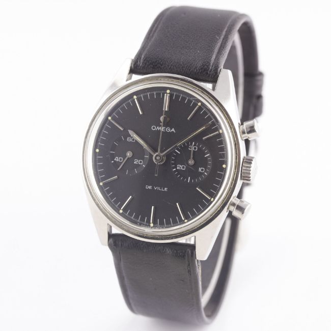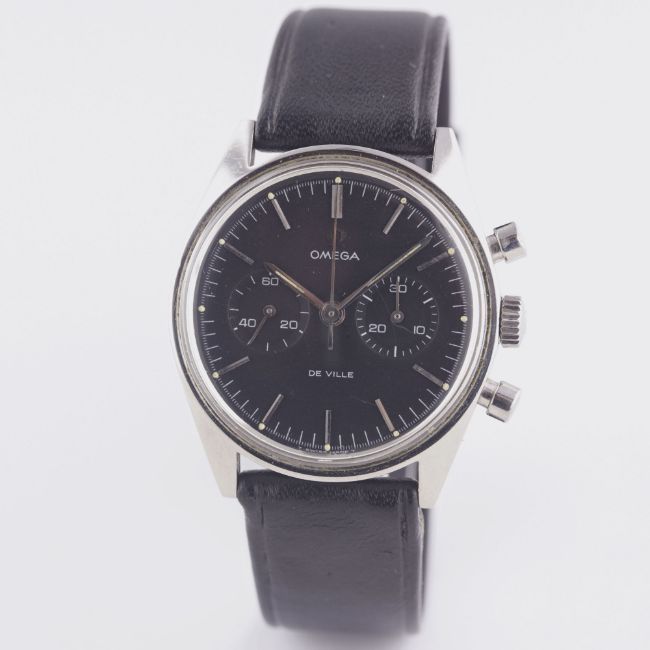 A RARE GENTLEMAN'S STAINLESS STEEL OMEGA DE VILLE CHRONOGRAPH WRIST WATCH CIRCA 1968, REF. 145.017 WITH MATT BLACK DIALMovement: 17J, manual wind, cal. 860, signed Omega, numbered. Case: Diameter approx. 35mm, screw back, signed Omega Watch Co, Omega crown.Strap: Leather. CONDITION REPORTDial: Original dial in excellent condition.Movement: Working at present.Case: In very good condition, with some small scratches due to general use.Strap/Bracelet: In very good condition.