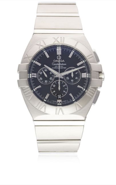 A GENTLEMAN'S STAINLESS STEEL OMEGA CONSTELLATION DOUBLE EAGLE AUTOMATIC CHRONOGRAPH BRACELET WATCH DATED 2007, REF. 15145100 WITH ORIGINAL WARRANTY CARDS Movement: 37J, automatic co-axial chronometer, cal. 3313, signed Omega, numbered. Case: Diameter approx. 44mm, exhibition back, signed, numbered, bezel engraved with Roman numerals, Omega crown.Bracelet: Original Omega Constellation bracelet. CONDITION REPORTDial: Original dial in excellent condition.Movement: Working at present.Case: In excellent condition.Strap/Bracelet: In excellent condition.