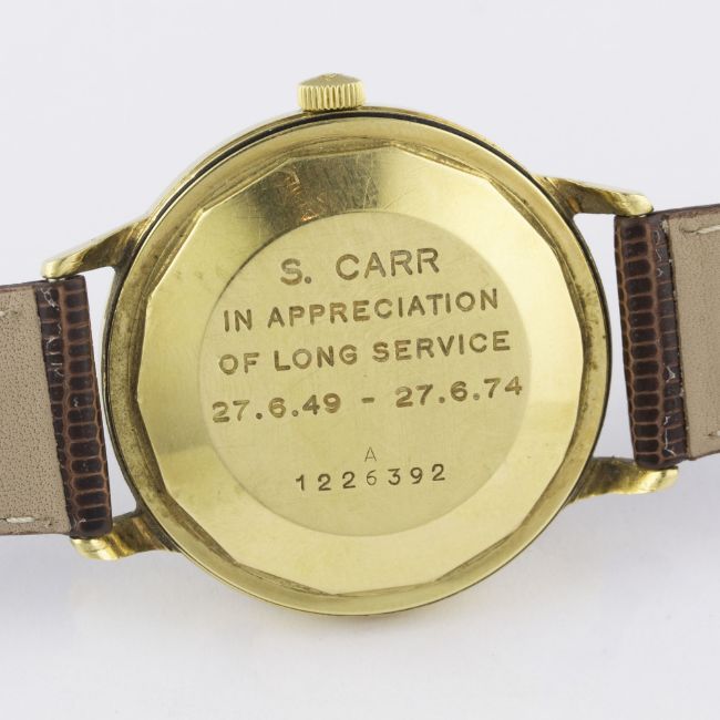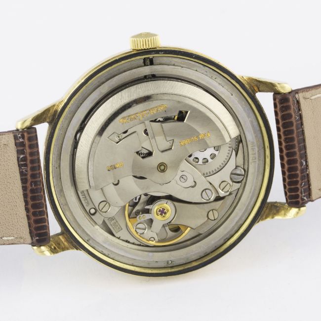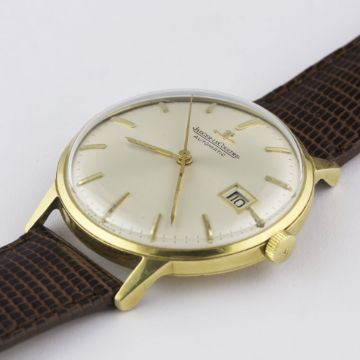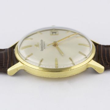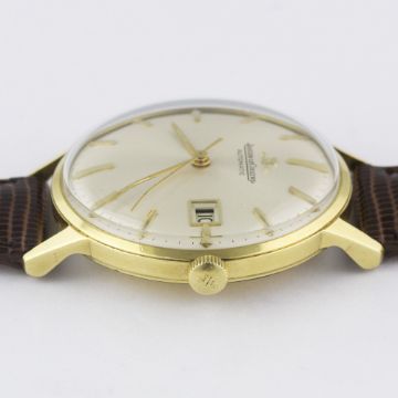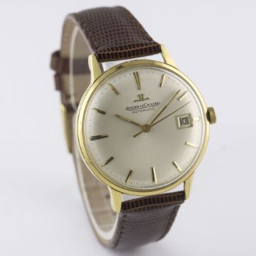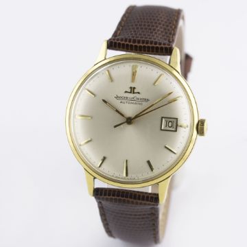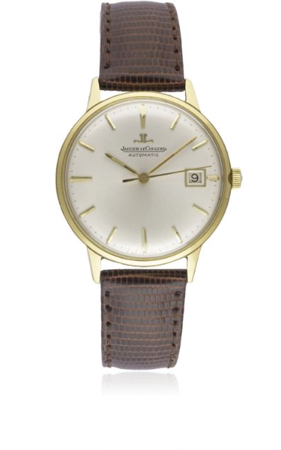 A GENTLEMAN'S 18K SOLID GOLD JAEGER LECOULTRE AUTOMATIC WRIST WATCH CIRCA 1960s Movement: Automatic, cal. K883, signed Jaeger-LeCoultre, numbered. Case: Diameter approx. 34mm, screw back, signed LC, numbered, presentational inscription to case back, 18k hallmarks, JLC crown.Strap: Leather. CONDITION REPORTDial: Original dial in excellent condition.Movement: Working at present.Case: In very good condition, with some small scratches due to general use.Strap/Bracelet: In excellent condition.