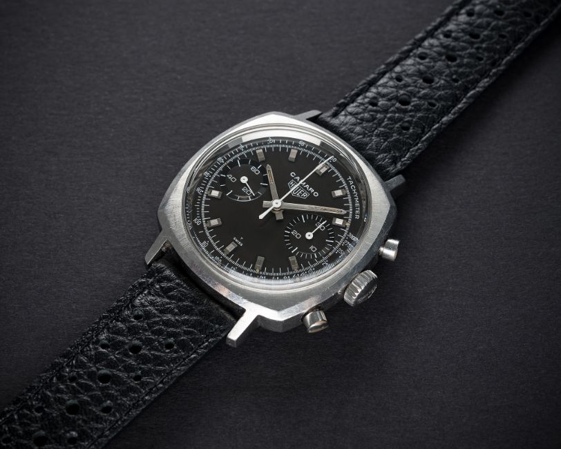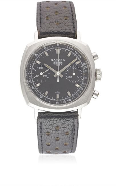 A RARE GENTLEMAN'S STAINLESS STEEL HEUER CAMARO CHRONOGRAPH WRIST WATCH CIRCA 1970, REF. 7743NT WITH BROWN "CHOCOLATE" DIALMovement: 17J, manual wind, Valjoux cal. 7730, signed Heuer Leonidas SA.Case: Width approx. 37mm, screw back, signed Heuer-Leonidas S.A., numbered, Heuer crown.Strap: Perforated leather. CONDITION REPORTDial: Original dial in excellent condition.Movement: Working at present.Case: In excellent condition, with light scratches due to general use.Strap/Bracelet: In excellent condition.