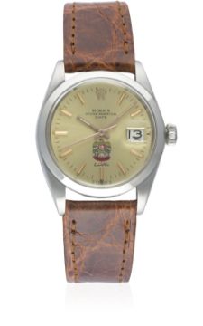 A VERY RARE GENTLEMAN'S STAINLESS STEEL ROLEX OYSTER PERPETUAL DATE WRIST WATCHCIRCA 1970s, REF. 1500 COMMISSIONED BY THE UAE MINISTRY OF DEFENCE Movement: 26J, automatic chronometer, cal. 1570, signed Montres Rolex S.A., numbered.Case: Diameter approx. 35mm, Oyster case, signed Montres Rolex S.A., numbered, smooth bezel, Rolex crown.Strap: Leather. CONDITION REPORTDial: Original dial in excellent condition.Movement: Working at present.Case: In excellent condition, with some light scratches due to general use.Strap/Bracelet: In excellent condition.