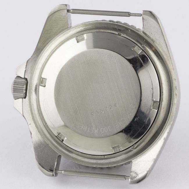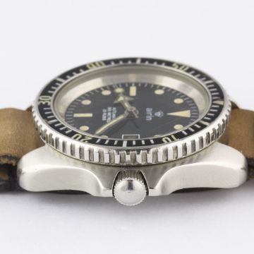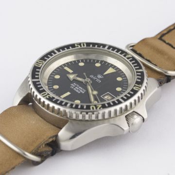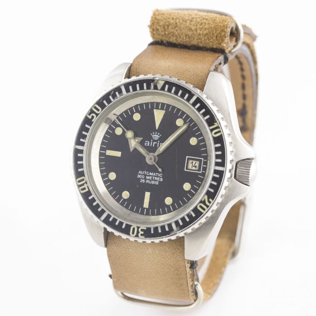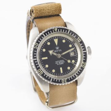 A RARE GENTLEMAN'S STAINLESS STEEL AIRIN 300M AUTOMATIC DIVERS WRIST WATCH CIRCA 1980, USED BY MARINE NATIONALE DIVERS AT THE FRENCH NAVY BASE IN BREST, CASE MADE BY M.R.P. S.A WHO ALSO PRODUCED CASES FOR BRITISH MILITARY CWC ROYAL NAVY DIVERS WATCHES OF THE PERIOD Movement: 25J, automatic, ETA cal. 2873.Case: Diameter approx. 42mm, screw back, signed M.R.P. S.A, numbered, 60 minute rotating bakelite bezel, screw-down crown, crown guards.Strap: Leather NATO. CONDITION REPORTDial: Original dial in excellent condition.Movement: Working at present.Case: In very good condition, some small signs of wear to bakelite bezel.Strap/Bracelet: In very good condition.